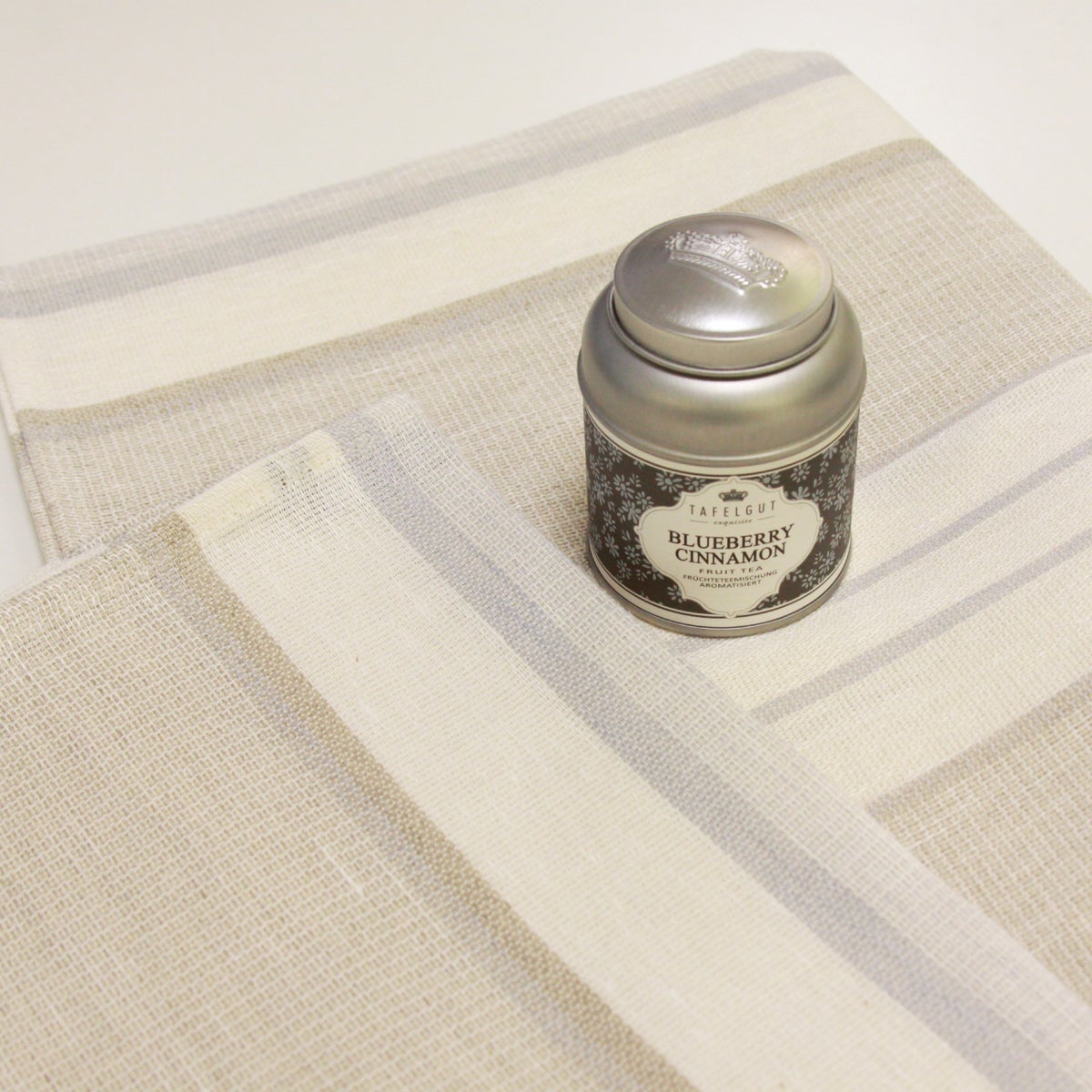 Pellavapyyhe vaalea jossa mustikkaraita ja valkeita sävyjä