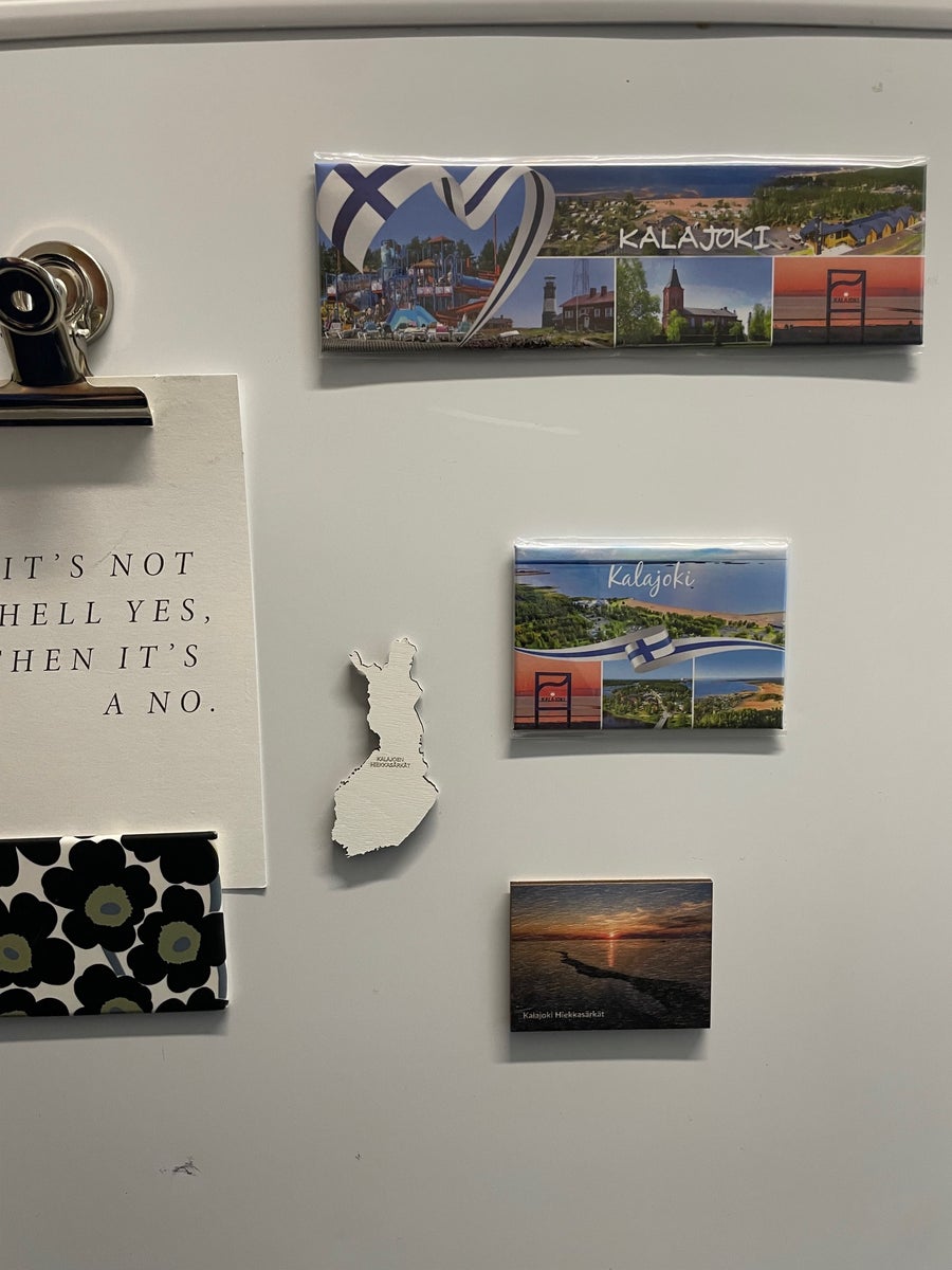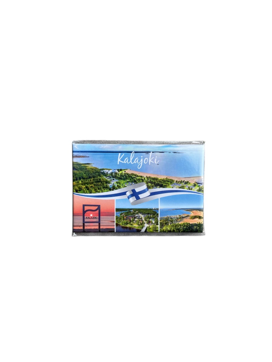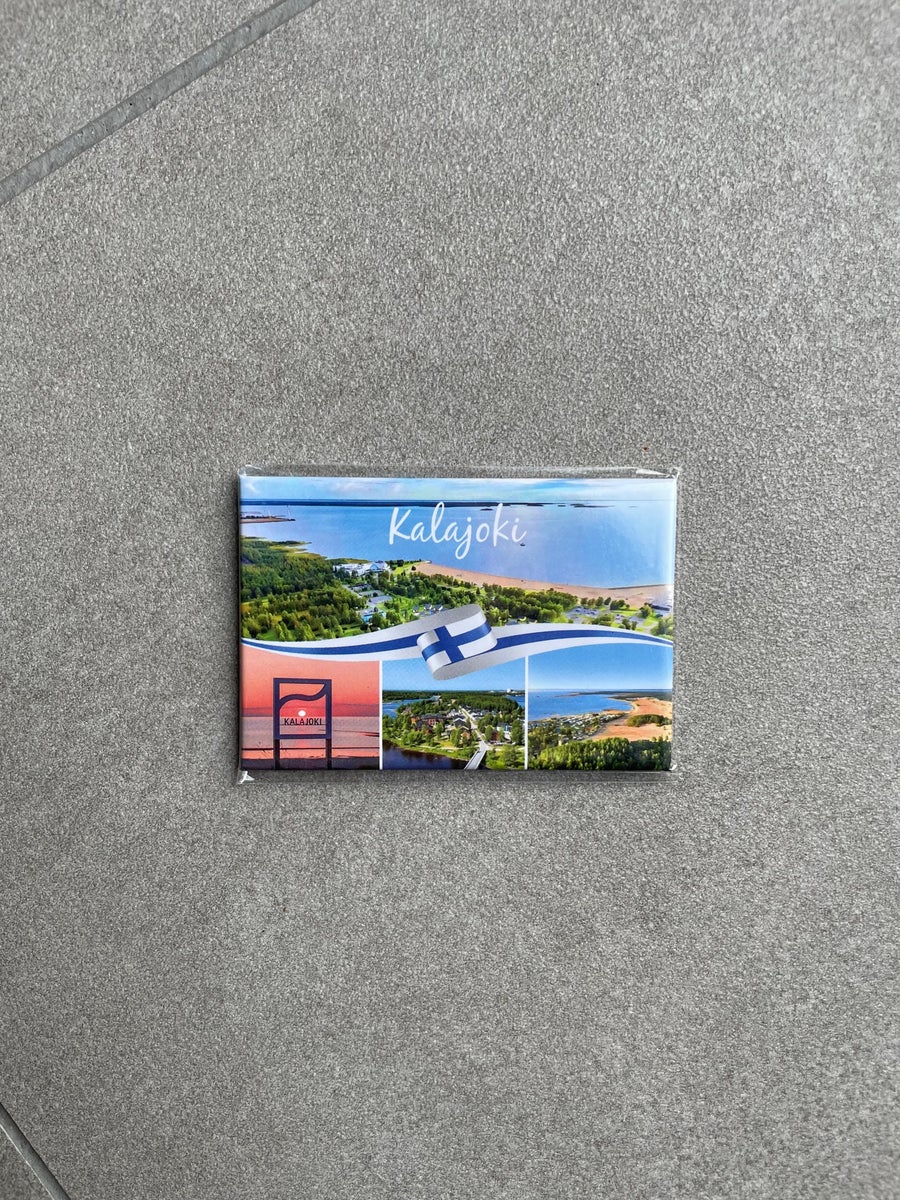 Kalajoki magneetti, jossa neljä kuvaa Kalajoen Hiekkasärkiltä. Ilmakuvat on Hiekkasärkiltä rannasta, saaristosta sekä auringonlasku hiekkasärkillä. Magneetissa on keskellä suomenlippu.