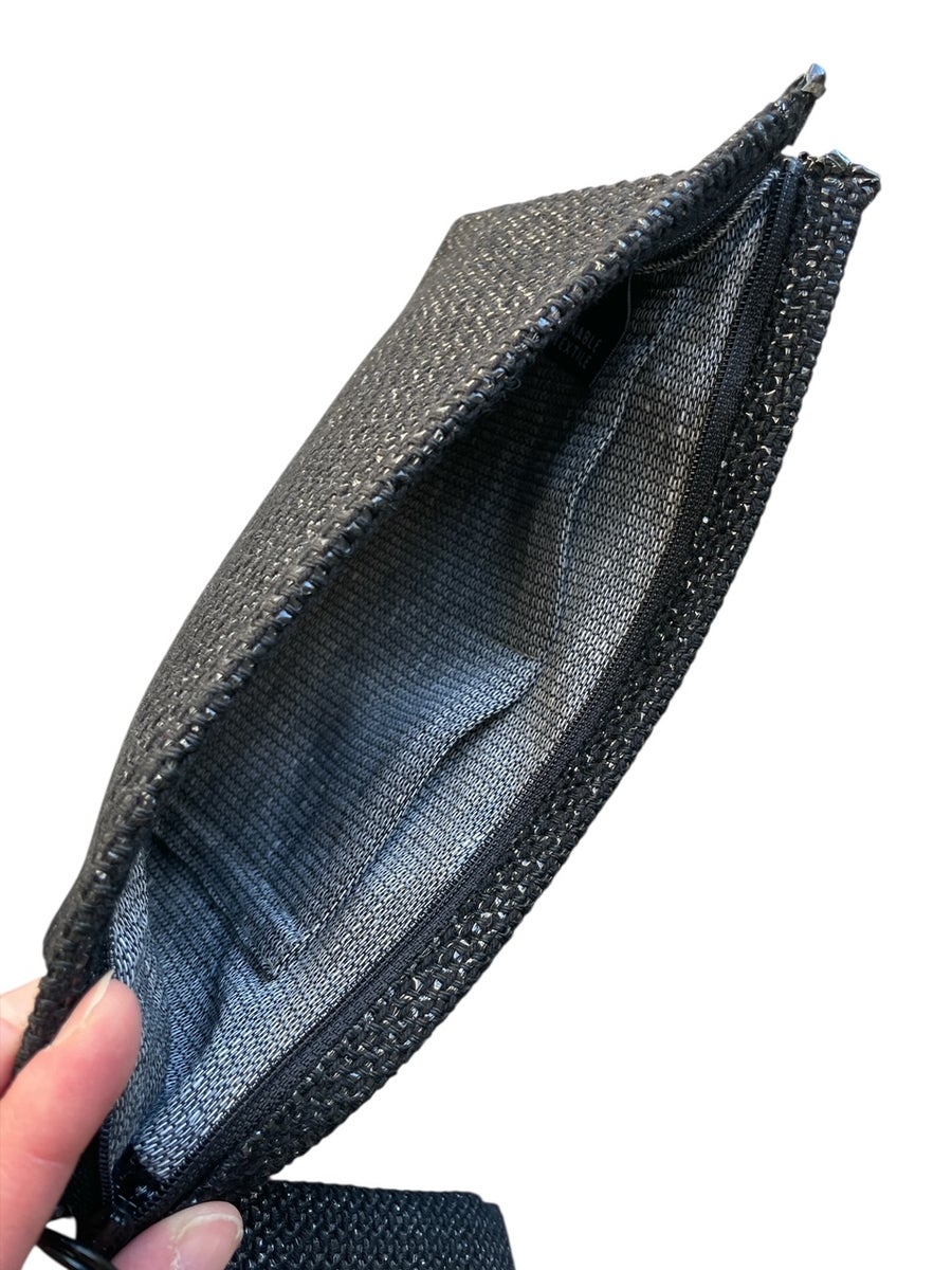 Kaunis, kevyt ja kimaltava pikkulaukku joka loistaa ranteessa kuin tuhannen ja yhden yön tarinat. Helposti mukana kulkevien kevyiden Pisa Fabric –laukkujen sisältä löytyy kaksi avointa sivutaskua. Materiaalin loiste tulee vanhoista videonauhoista, jotka on käsin kudottu pellavan ja puuvillan kanssa kestäväksi kankaaksi. Laukussa on vetoketjusuljin ja sen päässä rannehihna samasta kimaltavasta kankaasta tehtynä.